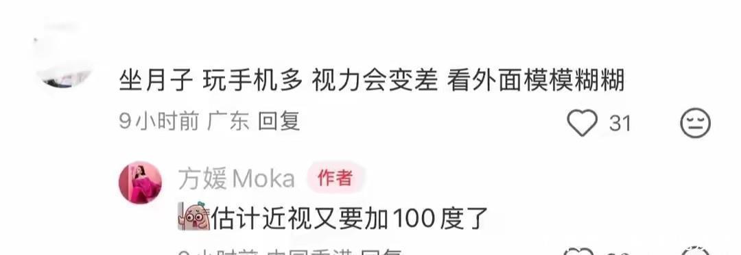 有网友贴心提醒“月子里少玩手机,伤眼睛”,方媛回复“估计近视又要加深100度了”。原来女神也近视,跟咱们普通人一样要戴眼镜,瞬间觉得亲近多了!