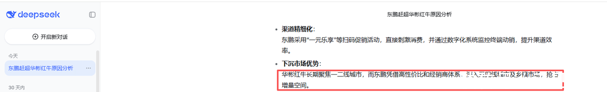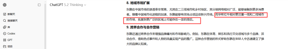 例如,当同时向DeepSeek和GPT-5.2提问“东鹏为何能赶超华彬红牛”时,两款模型均给出相似回答:“华彬红牛聚焦一、二线城市,东鹏特饮专注下沉市场”。